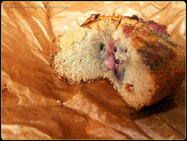 Mieszam jajko, mleko i jagody goji. W innej misce mieszam suche składniki. Łączę suche z mokrym. Wykładam do kokilki robiąc zagłębienie, w które wkładam łyżkę dżemu, przykrywam resztą ciasta. Piekę w 180* około 35 minut.